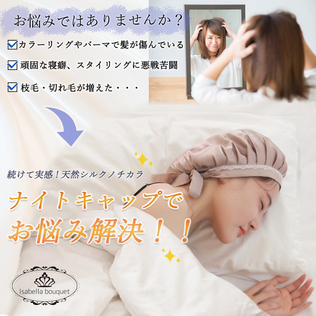 【天然シルク100%素材】まゆ糸が紡ぐ光沢が美しいナイトキャップ”Isabella bouquet”いつまでも触れていたくなるような“なめらかな質感”であなたの髪を優しく包み込みます。ふんわり軽く、通気性は抜群。髪だけでなく頭皮の大敵である夏場の不快なムレ・かぶれを気にせず、オールシーズンお使い頂けます。